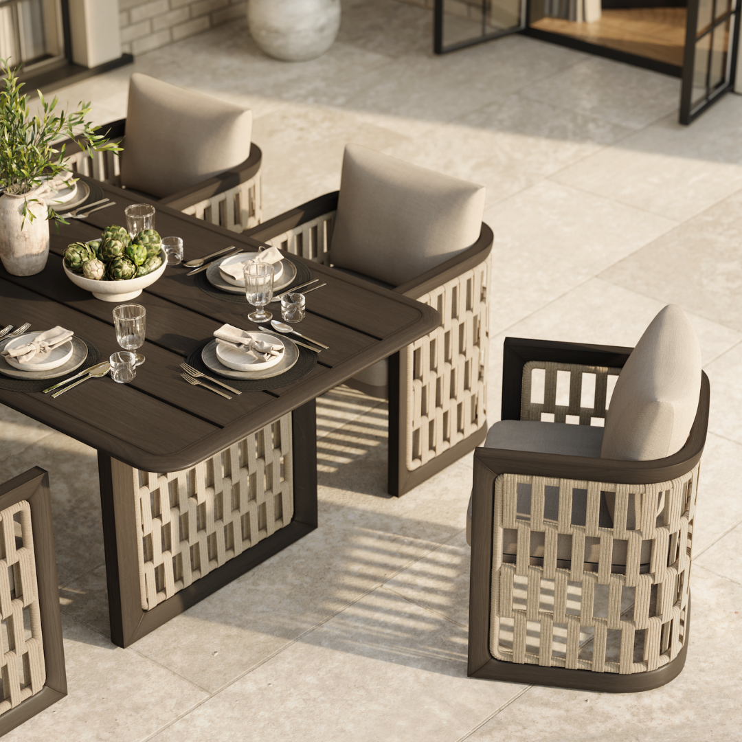 The N2 Dining Table is exquisitely finished in darkened teak and can accommodate up to six guests in unparalleled style. This table is crafted with a flawless blend of contrasting materials combing an intricately carved teak frame with hand woven panels, adding both texture and transparency to its silhouette. Its wide top showcases the warm, linear grain of the teak. The clean, expansive surface is supported by a base of contrasting rope lattice, an interplay of light and shadow.