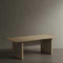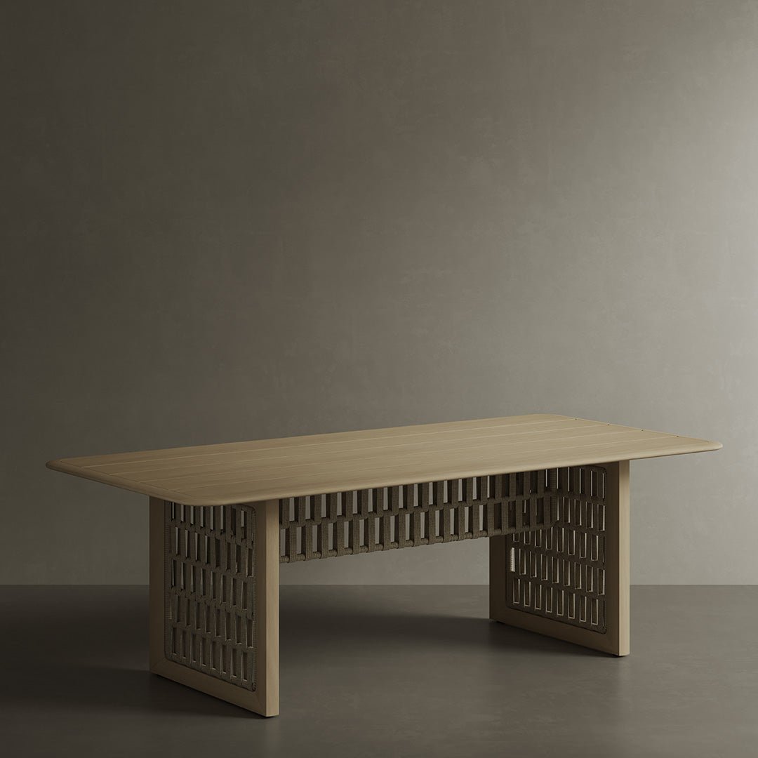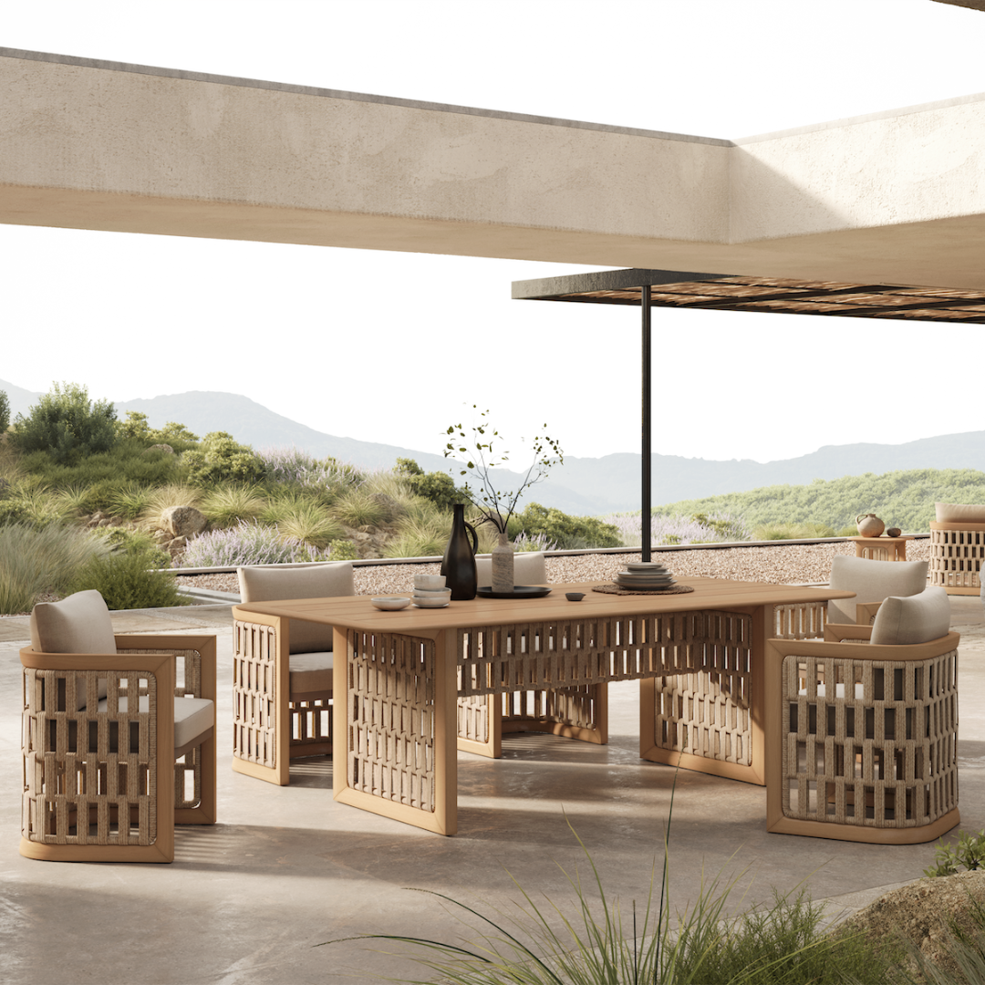 The N2 Dining Table is exquisitely finished in teak and can accommodate up to six guests in unparalleled style. This table is crafted with a flawless blend of contrasting materials combing an intricately carved teak frame with hand woven panels, adding both texture and transparency to its silhouette. Its wide top showcases the warm, linear grain of the teak. The clean, expansive surface is supported by a base of contrasting rope lattice, an interplay of light and shadow.